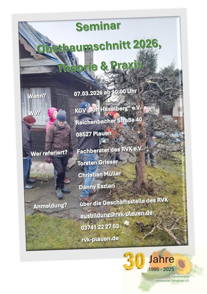 Am Samstag, den 07.03.2026 findet ab 10 Uhr im KGV „Am Haselberg“ das Seminar Obstbaumschnitt 2026 statt. Wer Zeit und Interesse hat, sollte sich diese interessante Veranstaltung nicht entgehen lassen.
